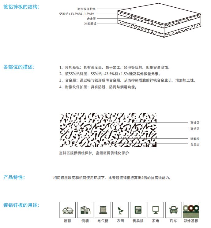 熱浸鍍鋁鋅是以冷板經過處理后,鋼廠通過高端的熱浸鍍技術,在冷板雙面表面鍍一定厚度及重量的鋁鋅合金,其各成份含量為標準的:含鋁55%,含鋅43.5%、含硅1.5%。使之成為由鋁鋅合金包裹的合金鋼,其防腐及抗氧化能力較之前的熱鍍鋅要翻一倍