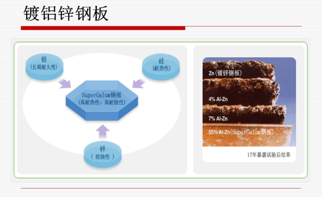 鍍層厚度情況下,鍍55%鋁鋅比鍍鋅耐腐蝕性高2-6倍。