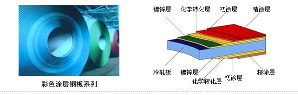 使用鍍鋅鋼板為基板的彩色涂 層鋼板,除有鋅保護外,鋅層上的有機涂層起了覆蓋隔離作用,可防止鋼板生銹,使用壽命比鍍鋅鋼板更長,據介紹涂層鋼板的使用壽命比鍍鋅鋼板長50%。
