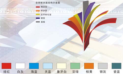 深綠灰、淺青藍、純藍、寶鋼藍、夜藍、寶鋼灰、白銀灰、亮銀、骨白、帝王白、云白、黃綠、大麥白、淺駝、銀灰、銀色、黃綠、云白、黃色、綠色、白色、紅色、黑色、天藍、深天藍、闊葉綠、瓷藍、橘黃、等等,顏色可按照客戶色卡和樣板定做。