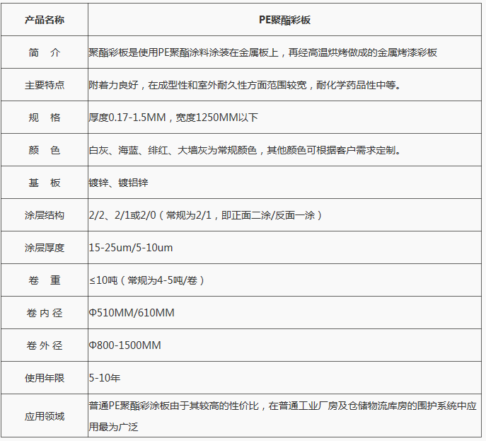 應用——由于PE聚酯彩涂板具有附著力良好,易于加工成型,顏色及光澤選擇面廣,價格低廉等特點,PE聚酯彩涂板是應用最為廣泛的彩涂產品,主要用于工業及環境污染低普通工業廠房、物流倉庫等領域