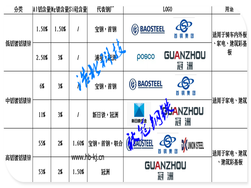 鍍鋁鎂鋅顧名思義就是熱浸鍍鋁鎂鋅合金鋼板,世界上比較成熟的鍍鋁鎂鋅板當屬日本新日鐵和韓國浦項鋼廠,2001年新日鐵研制成功并生產Zn-3%Mg-11%Al鍍層的產品取名SuperDyma,簡稱SD板,其全稱應該是鍍鋁鎂鋅(硅)板。浦項鋅鋁鎂全稱是POSCO Magnesium Aluminium Alloy Coating product,采用POSCO的專有技術開發的Zn-3%Mg-2.5%Al的三元高耐蝕性合金鍍鋅鋼板,簡稱PosMAC。