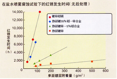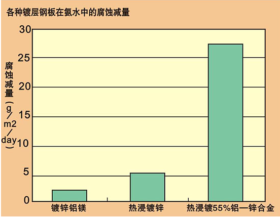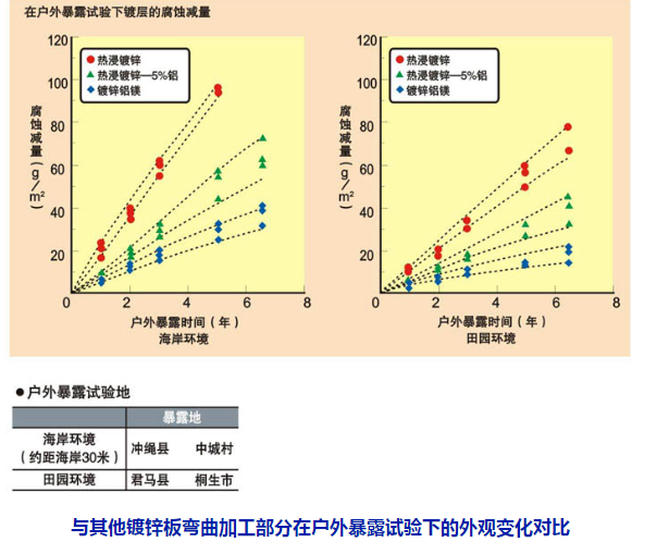 約7年的暴露結果表明,鍍鋅鋁鎂鋼板比熱浸鍍鋅鋼板的耐蝕性約高4倍。隨著時間的推移,鍍鋅鋁鎂鋼板比其他鍍層鋼板出現的腐蝕減量下降,因此鍍鋅鋁鎂鋼板與其他鍍層鋼板的耐蝕性差距將會進一步拉大。
