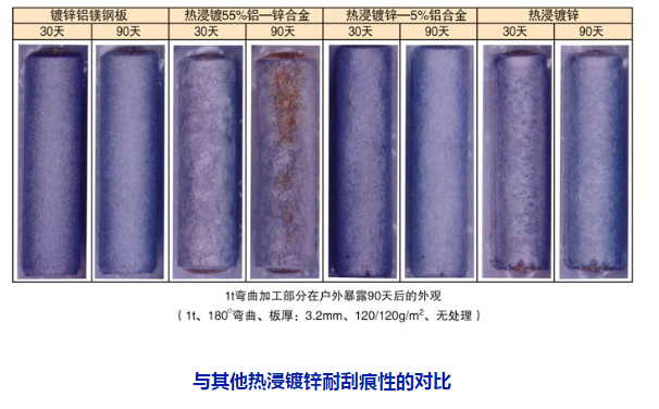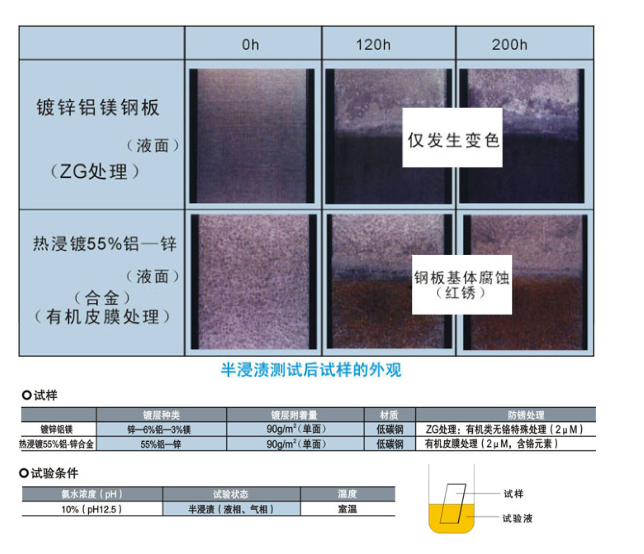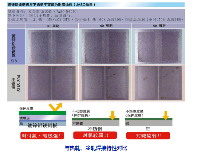但作為面板表面等使用時的“耐紅銹性”,鍍鋅鋁鎂鋼板極為優異。抗腐蝕非常強的鋁的耐腐蝕性,也是由其表層的不動態皮膜所實現的。但是,鋁具有對“堿”較弱的性質。